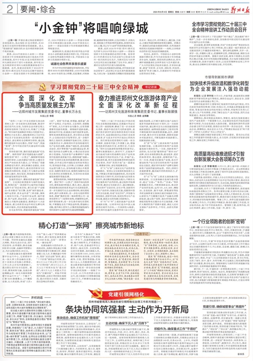 “黨的二十屆三中全會把深化國企改革納入進(jìn)一步全面深化改革戰(zhàn)略、推進(jìn)中國式現(xiàn)代化全局,為國有企業(yè)在新征程上改革轉(zhuǎn)型指明了前進(jìn)方向,明確了工作重點。”鄭州城市發(fā)展集團(tuán)有限公司黨委書記、董事長萬永生表示,城發(fā)集團(tuán)將以習(xí)近平總書記關(guān)于全面深化改革的一系列新思想、新觀點、新論斷和全會精神為指導(dǎo),通過戰(zhàn)略性重組和專業(yè)化整合,苦練“內(nèi)功”,筑強(qiáng)“筋骨”,爭當(dāng)中國式現(xiàn)代化建設(shè)鄭州實踐的主力軍。
