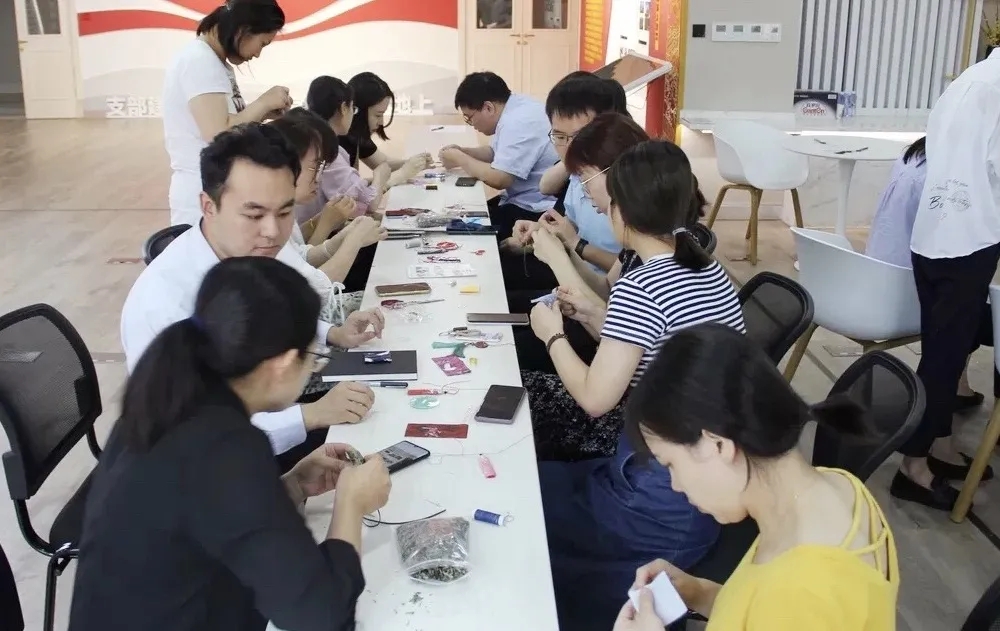 在濃厚的氛圍中,大家開始制作香囊。大伙一邊穿針引線,學習香囊制作,一邊互幫互助,相互溝通交流。
