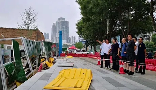尤其是亳都古巷考古基坑面積較大,且全部被水淹沒,該地塊東側(cè)緊鄰古城墻,西側(cè)緊鄰鄭州文廟和中建文苑,盲目抽排基坑積水可能會對周邊古建筑及居民小區(qū)帶來安全隱患。面對險(xiǎn)情,為確保項(xiàng)目現(xiàn)場安全,鄭州商都商業(yè)發(fā)展有限公司立即啟動緊急預(yù)案,明確防汛搶險(xiǎn)責(zé)任分工,迅速開展防汛搶險(xiǎn)工作。